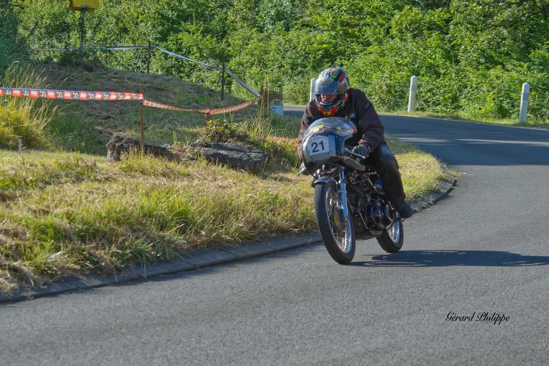 Démonstration de motos et side-cars de vitesse sur un parcours routier préalablement fermé à la circulation. Ni chronométrage ni classement. Machines anciennes,…