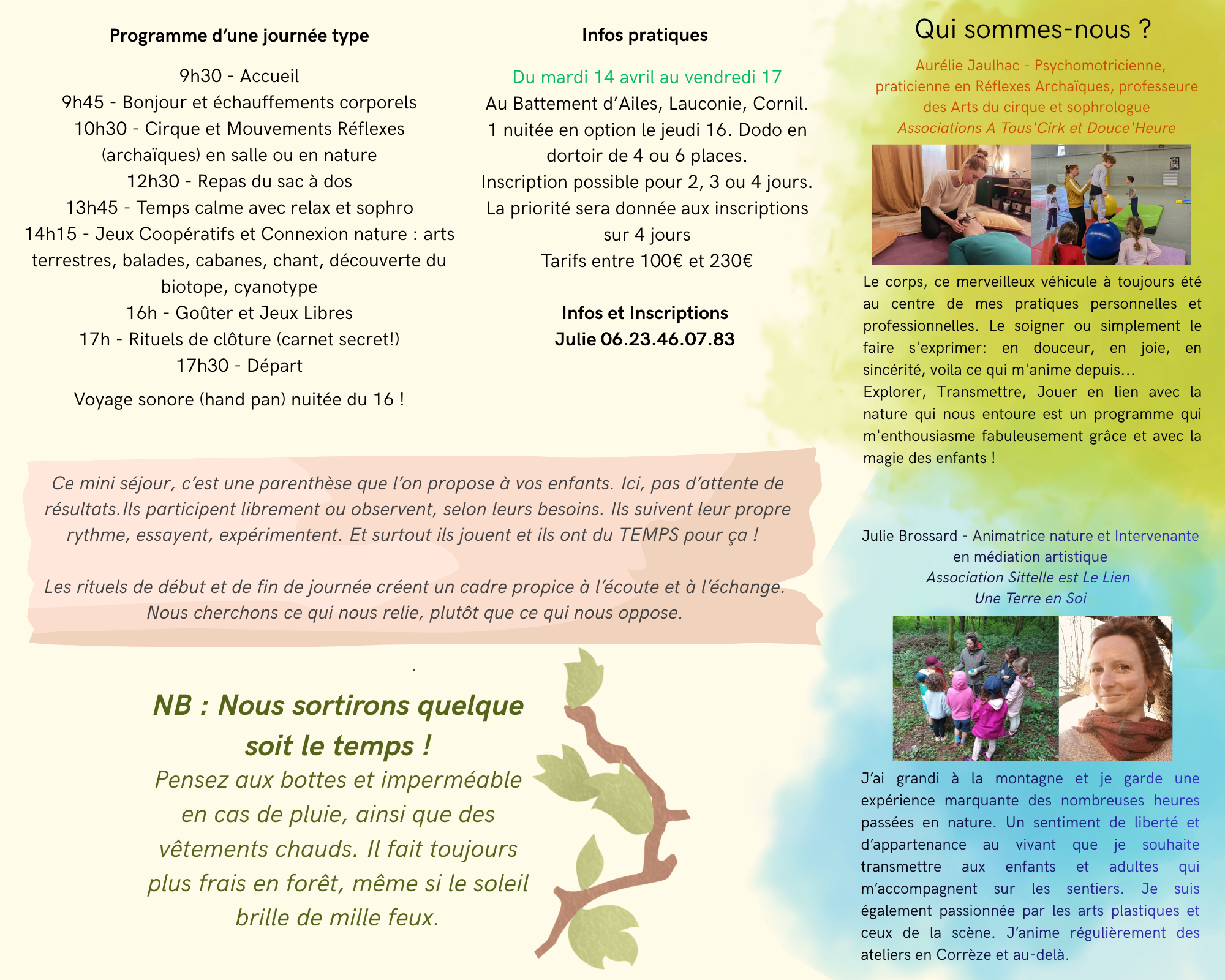 Connexion nature : arts terrestres, balades, cabanes, chant, découverte du biotope. Jeux coopér…