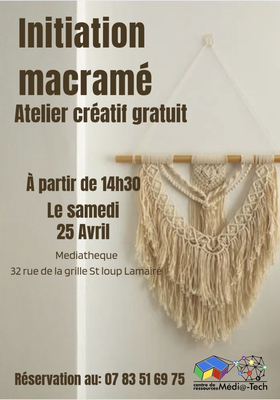La Médi@tech propose un atelier macramé de 15 h à 17 h, niveau débutant, avec Nathalie. Possibilité d'apporter son matériel. L'animation est gratuite, l'inscri…