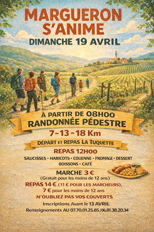 Margueron S'Anime organise le dimanche 19 Avril à partir de 8h une randonnée pédestre "Randonnée des moulins" (7 - 13 - 18 km).