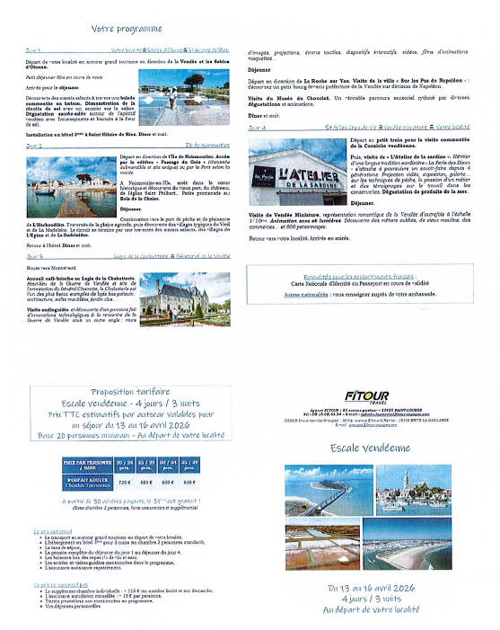 Escale Vendéenne de 4 Jours/3 Nuits du 13 au 16 avril 2026 proposée par l'Amicale des Retraités .