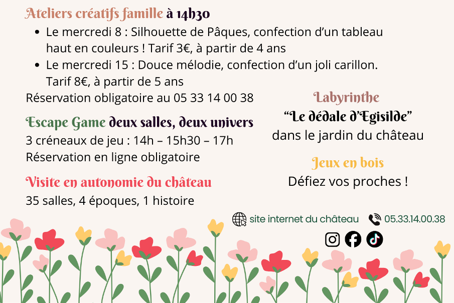 Durant les vacances de Pâques, le château s'anime, venez visiter le château de Duras et participez aux animations :