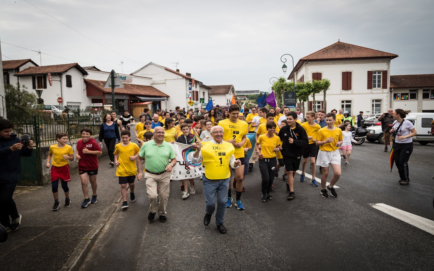Passage des coureurs de la course relais pour le soutien de l'occitan, gascon, la " lenga nosta " , elle arrivera de la route de Came, passera ensuite rue des j…
